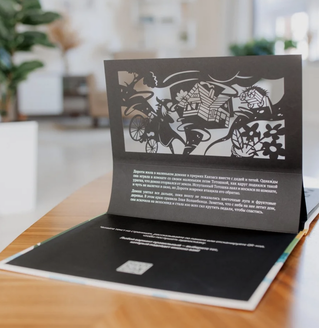 В коробке: волшебная книжка с резными иллюстрациями, под которыми расположен текст сказки.