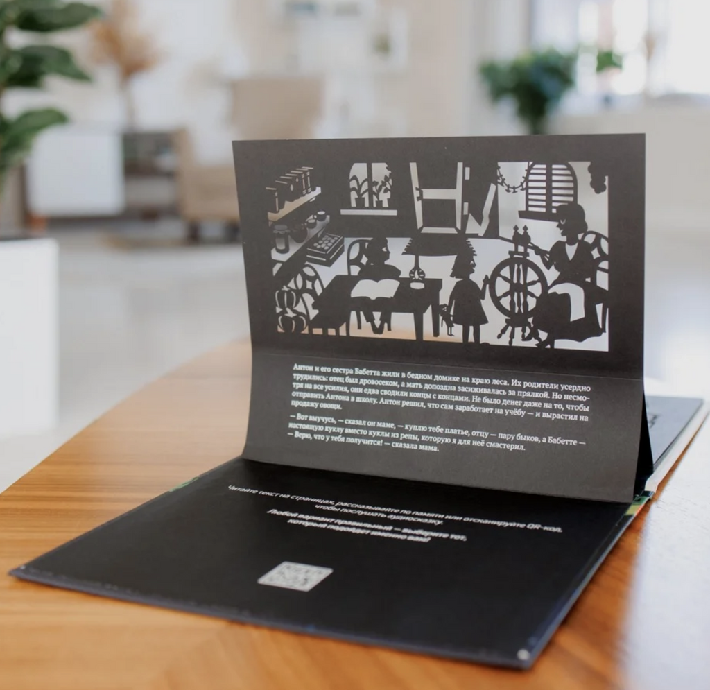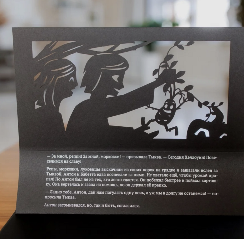 В коробке: волшебная книжка с резными иллюстрациями, под которыми расположен текст сказки.
