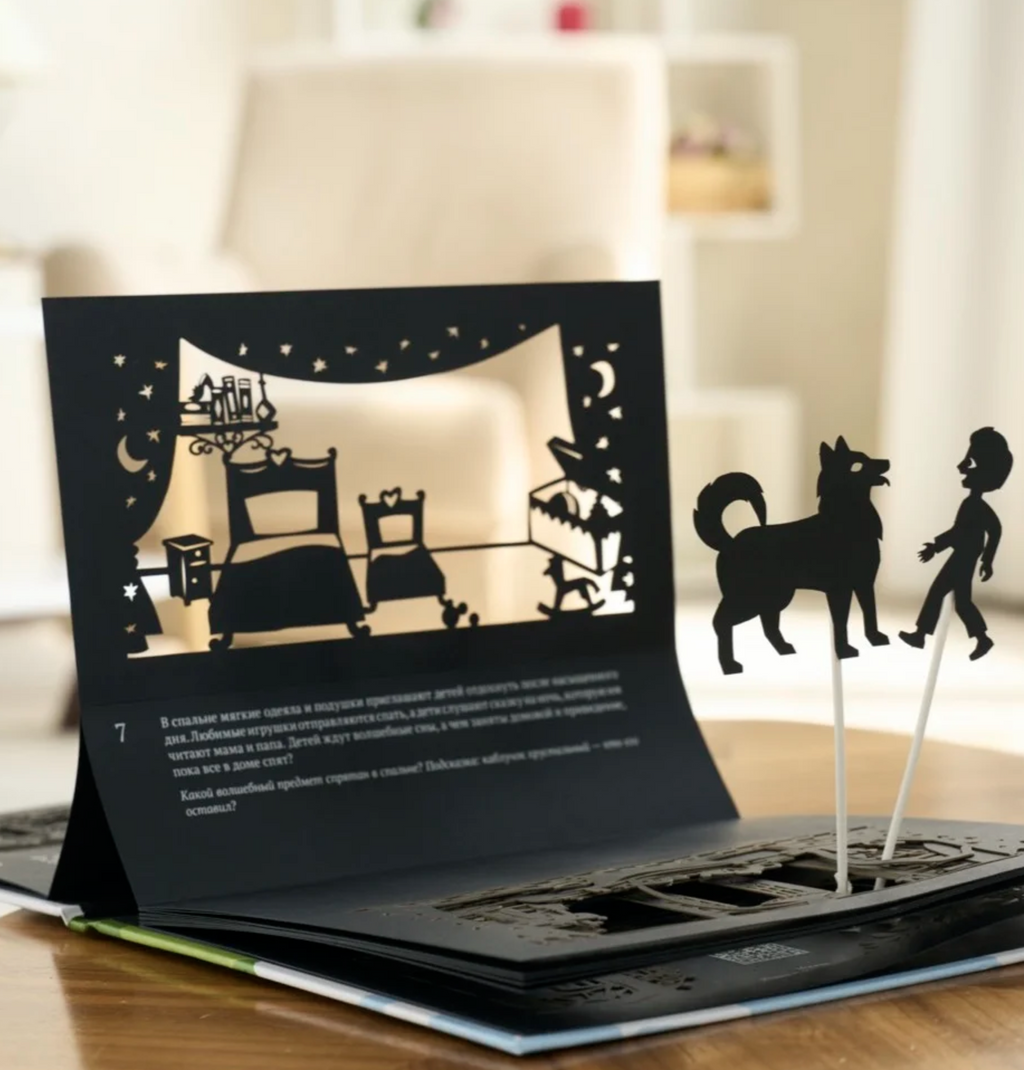 Уникальная, запатентованная конструкция, которая при открытии книги приводит страницы в вертикальное положение — идеально для теневого представления.
