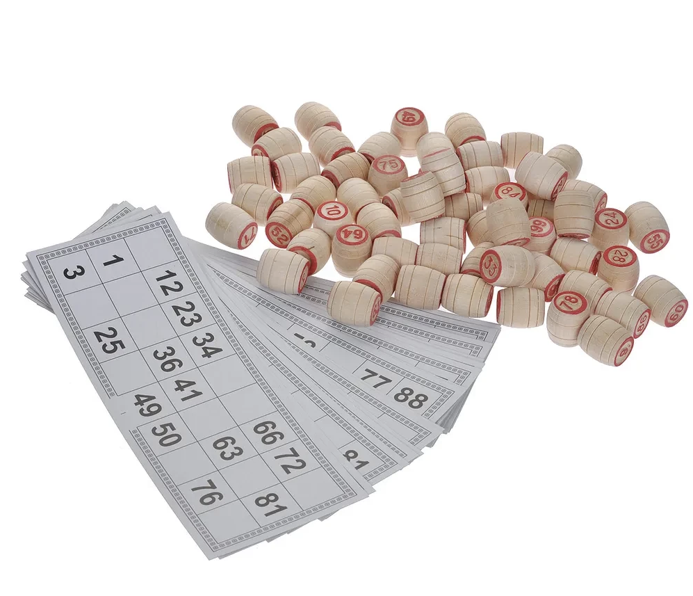 В наборе: деревянные бочонки - 90 шт; мешочек для бочонков; картонные карточки - 24 шт
