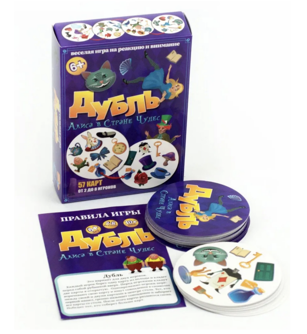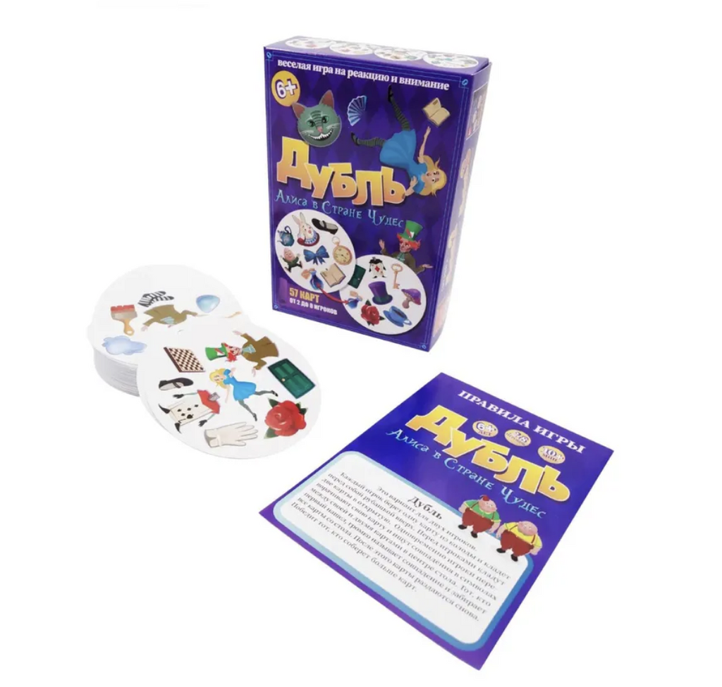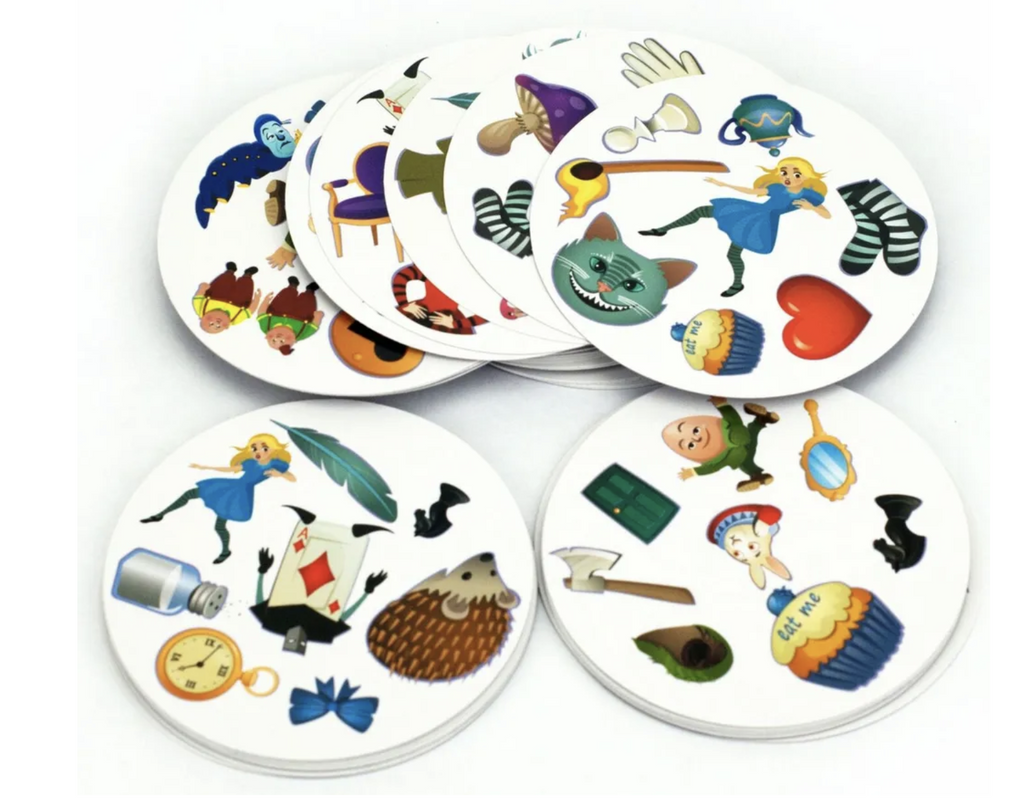 В состав игры входит 57 круглых карточек, на каждой из которых размещено 8 рисунков. При этом на двух любых карточках всегда есть только один общий рисунок. Все рисунки связаны со сказкой Алиса в стране чудес.