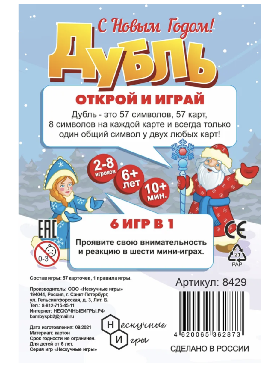 Веселая игра на внимание и реакцию для всей семьи. Цель: находить одинаковые изображения на карточках. В состав игры входит 57 круглых карточек, на каждой из которых размещено 8 рисунков. При этом на двух любых карточках всегда есть только один общий рисунок. Авторами предлагается 6 разных игр. Принцип в них одинаковый, нужно быстрее других находить одинаковые картинки на открытых карточках. Игра Дубль тренирует внимательность и скорость реакции. Она будет интересна и детям и взрослым. И подойдет и для детских праздников, и для семейных игр, и для посиделок с друзьями. Благодаря компактному размеру игру удобно брать с собой. На всех картинках в игре изображены животные. Карточки выполнены из достаточно плотного глянцевого картона.