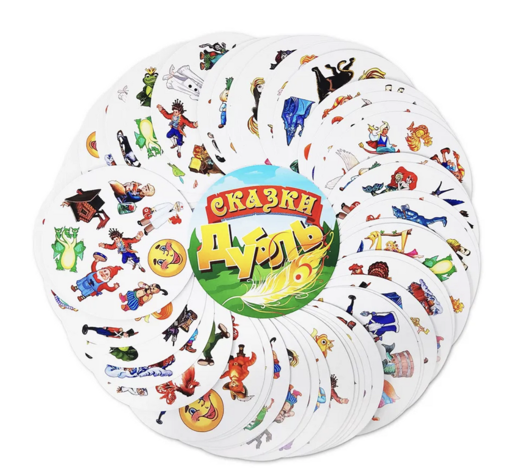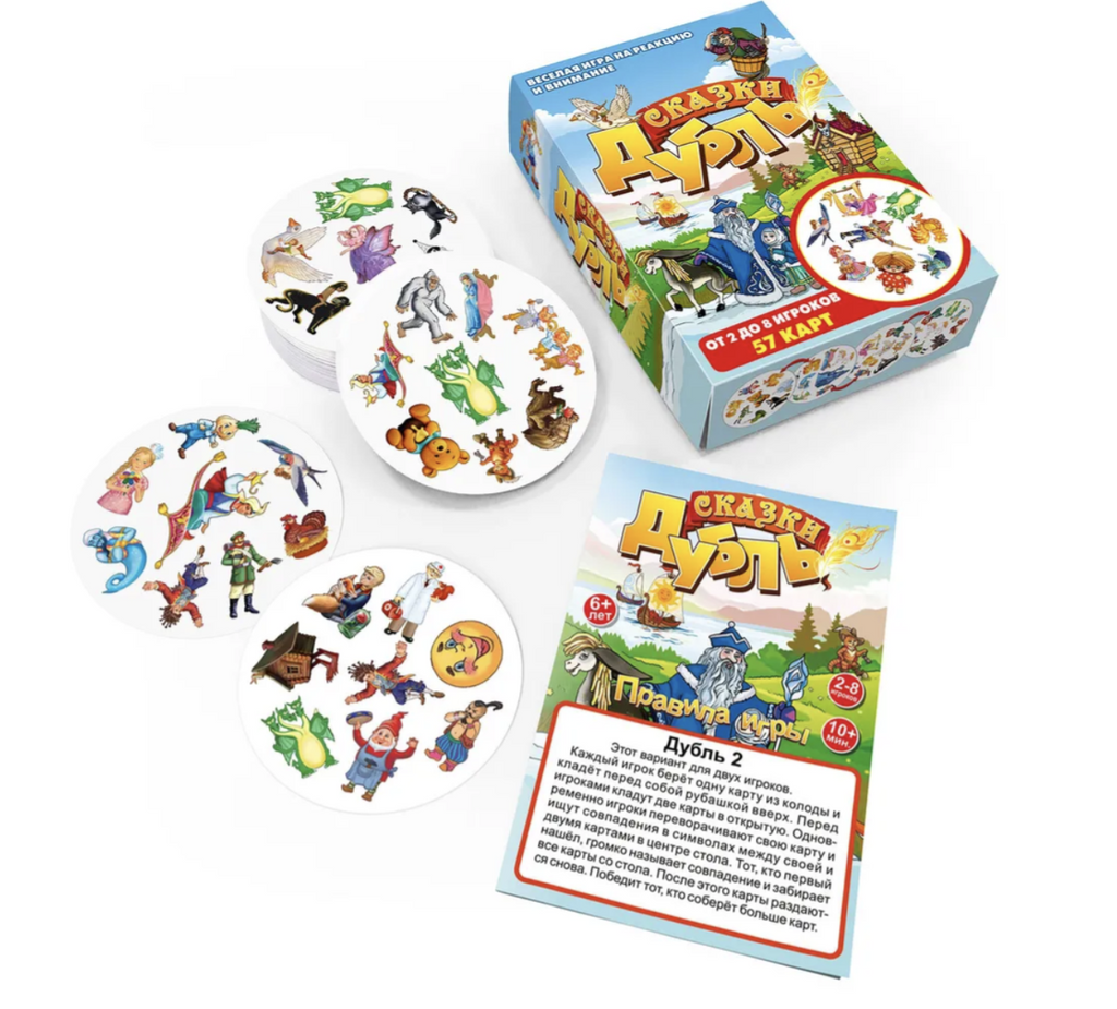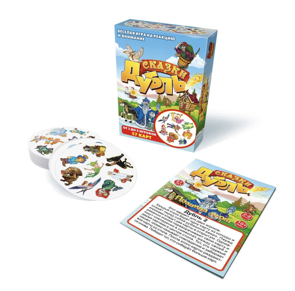 Веселая игра на внимание и реакцию для всей семьи. Цель: находить одинаковые изображения на карточках. В состав игры входит 57 круглых карточек, на каждой из которых размещено 8 рисунков. При этом на двух любых карточках всегда есть только один общий рисунок. Игра Дубль тренирует внимательность и скорость реакции. Она будет интересна и детям и взрослым. И подойдет и для детских праздников, и для семейных игр, и для посиделок с друзьями. Благодаря компактному размеру игру удобно брать с собой. На всех картинках в игре изображены сказочные персонажи. Карточки выполнены из достаточно плотного глянцевого картона.