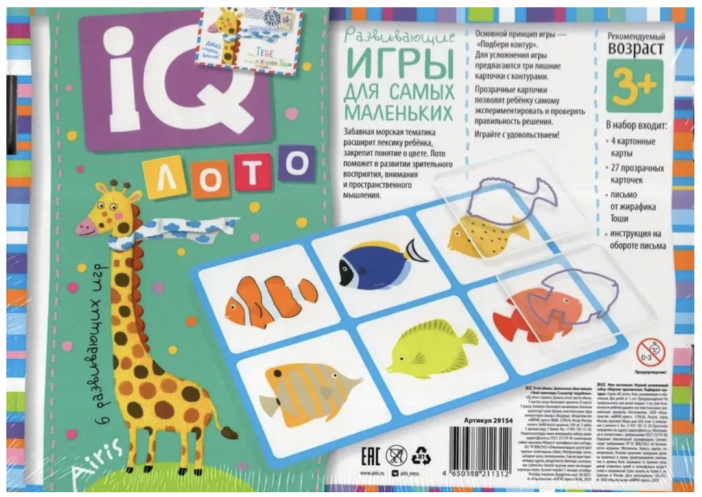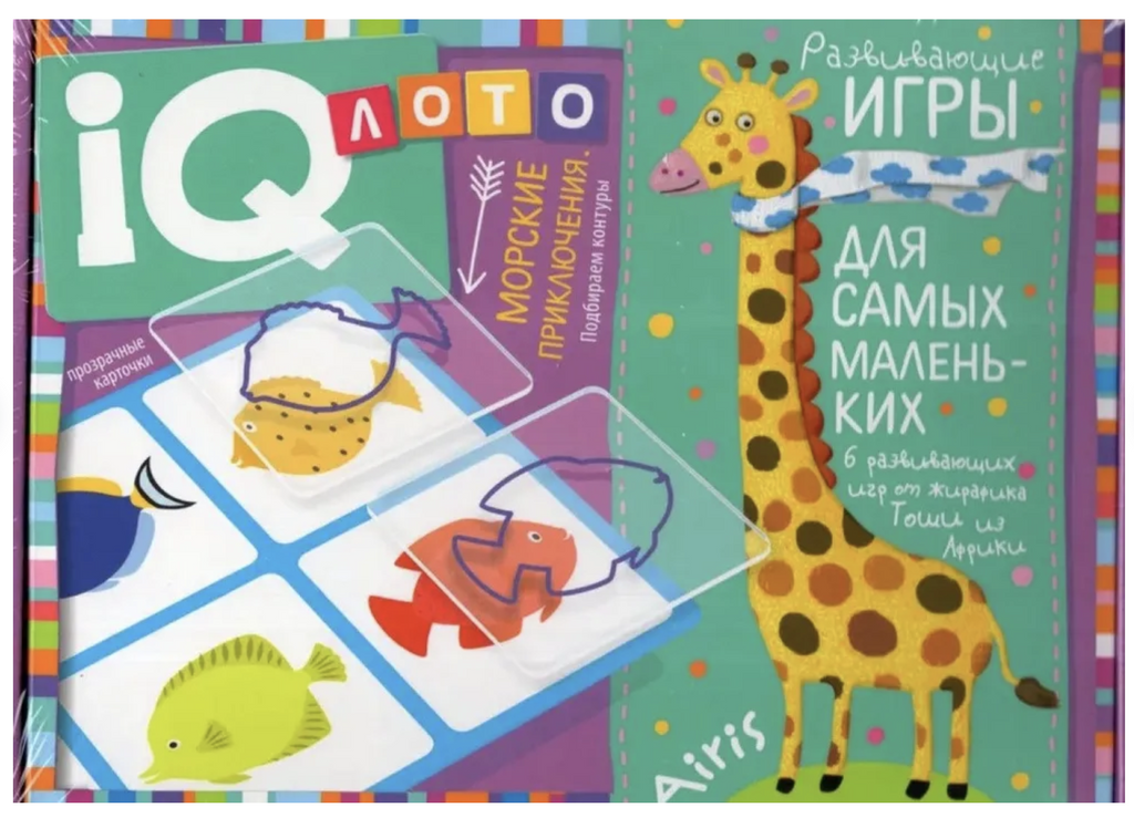 Пластиковое лото для малышей (нов) 3+ Морские приключения. Подбираем контуры Лото разработано с учётом возрастных особенностей малышей. Забавная морская тематика расширит лексику ребёнка, закрепит понятие о цвете, а специальный подбор картинок научит обобщать и анализировать, заложит основы структурного мышления. Основной принцип игры - "Подбери контур". Лото поможет в развитии зрительного восприятия, внимания и пространственного мышления. Прозрачные карточки позволят ребёнку самому экспериментировать и проверять правильность решения. В наборе 4 картонные карты, 27 прозрачных карточек и конверт, в котором ребёнок найдёт письмо от жирафа Тоши, а взрослые - инструкцию.