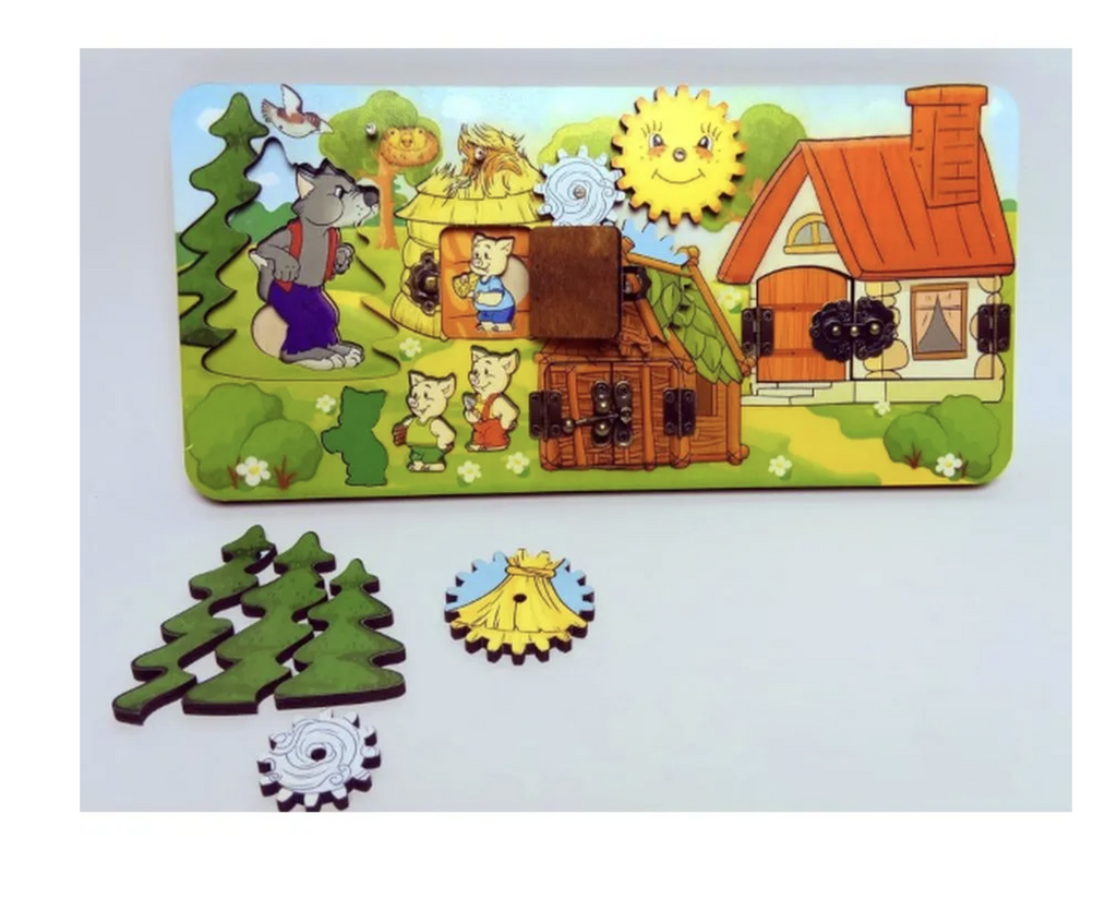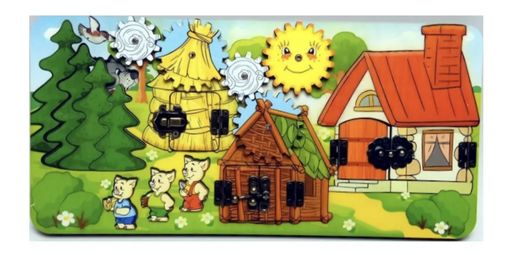 Бизиборд Три поросенка - это многофункциональная деревянная развивающая игра для малышей:
