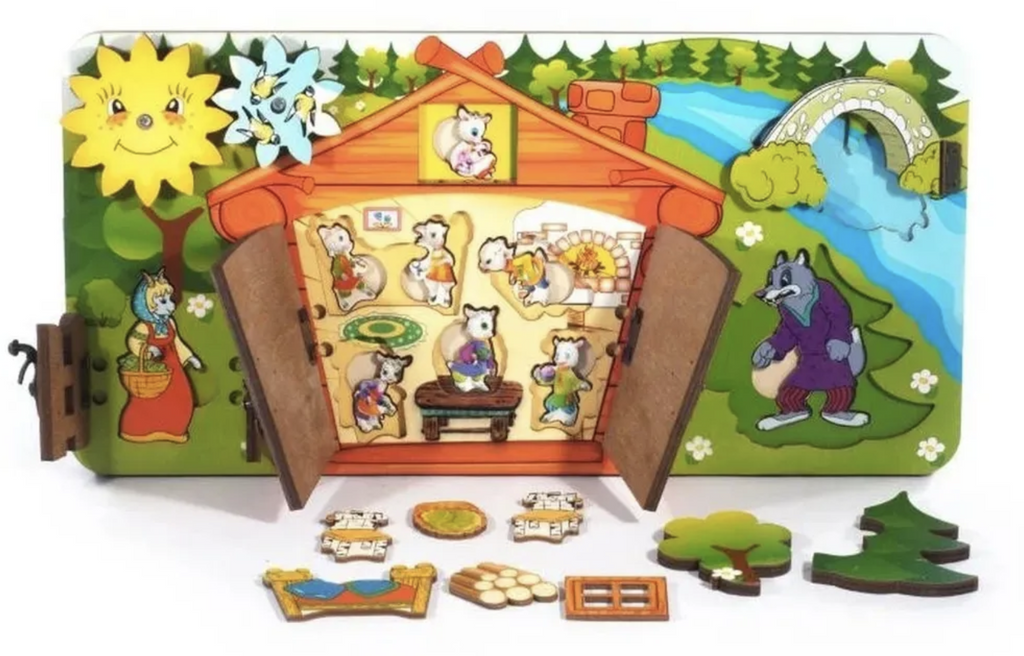 Развивающая доска Козлята и волк - многофункциональная игрушка для детей. С одной стороны, это развивающая панель, на которой расположено множество элементов для развития мелкой моторики и логики ребенка. А, с другой стороны, это подвижные декорации для инсценировки сказки Волк и семеро козлят. На доске расположены: - 2 шестеренки, которые можно вращать одновременно. Шестеренки можно снять с панели и поменять местами. - 2 замочка-крючка - Вынимающиеся вкладыши. Многие выемки двухслойные, сначала вынимается предмет интерьера, а за ним прячутся козлята. Фигурки козлят также вынимаются из основы. - Откидывающийся мост. Авторы предложили свою концовку сказки: волк падает с моста в реку, от удара его пузо лопается и козлята выбираются наружу. С помощью такой доски можно очень интересно разыграть сказку. Сначала Вы сами можете рассказывать малышу историю, а затем просите его присоединиться. Такая инсценировка отлично развивает речь и память ребенка.