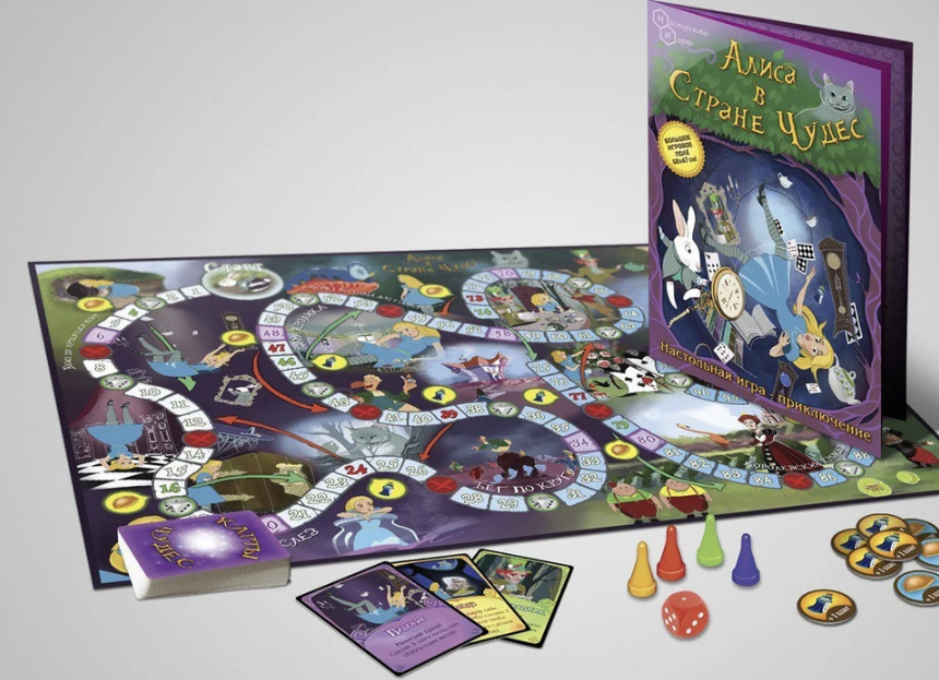 Алиса в Стране чудес — настольная игра - ходилка, которая отправляет своих участников в увлекательное путешествие вместе с героями любимой сказки. Трудно предугадать, куда их заведут приключения, и какие выпадут задания. Им предстоит попасть в море собственных слёз, выпить непонятную жидкость и увеличиться в росте. А еще они познакомятся с Чеширским Котом и Герцогиней, сыграют в королевский крокет и посетят чаепитие! Как играть: На столе раскладывается игровое поле, колода карт перемешивается и размещается рядом. Каждый участник получает жетоны зелья и пирога, а также цветную фишку, которую выставляет на «Старт». Путешествие начинается со входа в кроличью нору и заканчивается на берегу реки, где Алиса проснется, поняв, что все приключения были удивительным сказочным сном. Участники ходят по очереди. В свой ход игрок бросает кубик и перемещает свою фишку на выпавшее число клеток. При движении игрок может попасть на клетку с эффетами: клетка с изображением кубика – игрок делает еще один бросок и передвигает фишку; клетка с зеленым номером перемещает игрока на несколько клеток вперёд; клетка с красным номером возвращает игрока на несколько клеток назад; клетка с красным крестиком — пропуск следующего хода; клетка с фиолетовым фоном – игрок тянет карточку из колоды Чудес и выполняет ее условие. Колода Чудес состоит из карт удачи, встречи и неудачи. Жетоны нужны для применения или отмены эффекта соответствующих клеток. Вариант быстрой игры — не используются карты Чудес и жетоны зелий Побеждает игрок, оказавшийся первым у финиша.