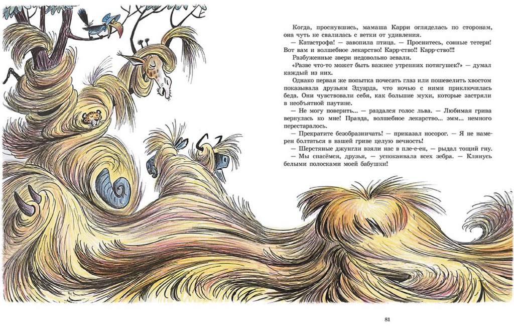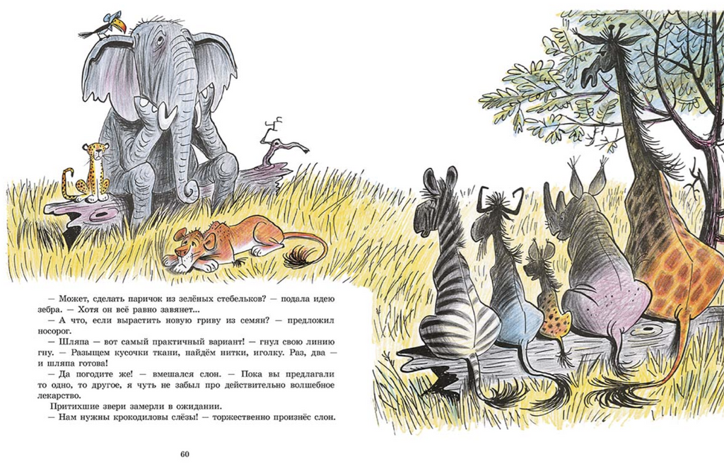 Лев Эдуард гордился своей роскошной гривой и на других поглядывал свысока. Но судьба любит посмеяться над зазнайками, и всего одна маленькая злая искра превратила предмет его гордости в пылающий куст. Вместе с гривой царь зверей утратил и свою уверенность. Теперь он хотел только одного — провалиться сквозь землю. Увы, спрятаться не получилось, беднягу заметила старая сплетница ворона Карри и вскоре постыдную тайну лысого льва обсуждала уже вся саванна. Вопреки опасениям Эдуарда, вид его голой, как коленка, головы вызвал у зверей искреннее сочувствие. Все наперебой предлагали свои варианты решения столь деликатной проблемы, но лишь слон смог от слов перейти к делу. И в одиночку отправиться на болото за волшебным лекарством — крокодиловыми слезами.