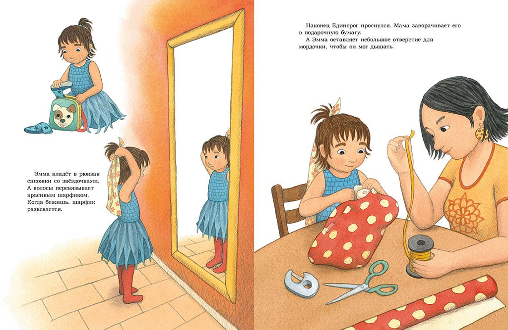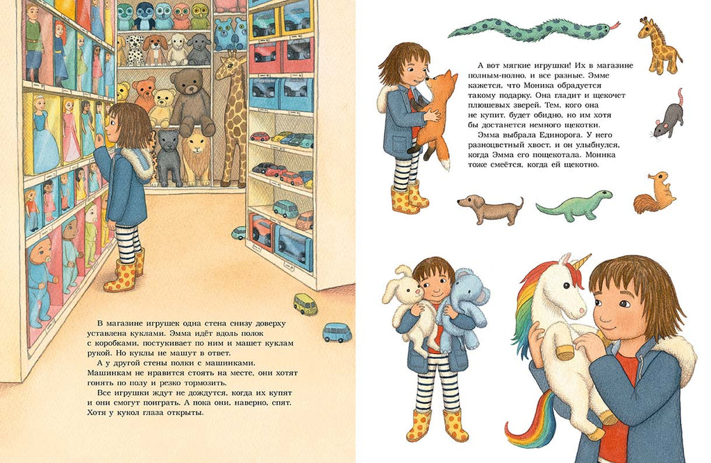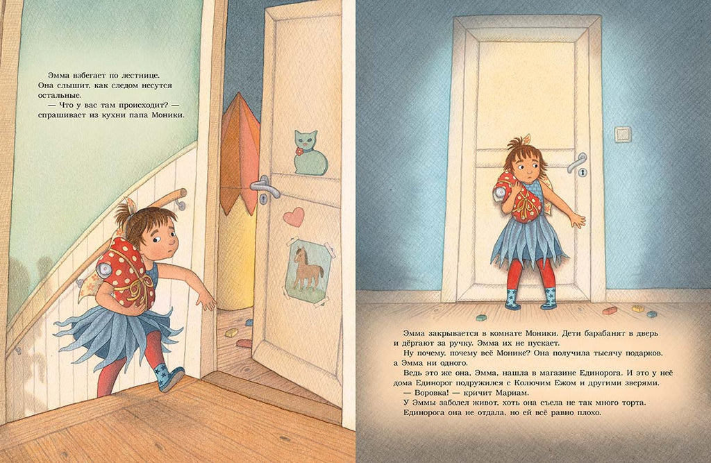 Эмма собирается на день рождения к Монике, своей лучшей подруге. В магазине игрушек она выбирает самое лучшее, что там есть, – Единорога. У него разноцветный хвост, и он улыбнулся, когда Эмма его пощекотала. Моника тоже смеется, когда ей щекотно. Вот она обрадуется этому подарку! Однако в гостях Эмма понимает, что просто не в силах расстаться с Единорогом, ведь он такой необыкновенный и уже успел подружиться с ее плюшевыми зверями. А у Моники и без него куча подарков. Она хватает Единорога и убегает с ним в детскую. Остальные бегут за ней, отнимают сверток и уходят веселиться дальше. А Эмма забирается в домик Моники и сжимается в комок, как ежик. На спине у нее иголки – никто не сможет ее погладить. Хотя гладить ее теперь никто и не захочет, потому что она воровка. Тут Моникин папа зовет Эмму играть в рыбалку. Ей и боязно, и хочется обратно к детям. И наконец она решается и идет. А потом все получают сладкие подарки и много смеются. А когда гости разошлись, подружки поднимаются в комнату Моники и угощают конфетами ее плюшевых зверей. И Эмма понимает, что Единорогу здесь нравится.