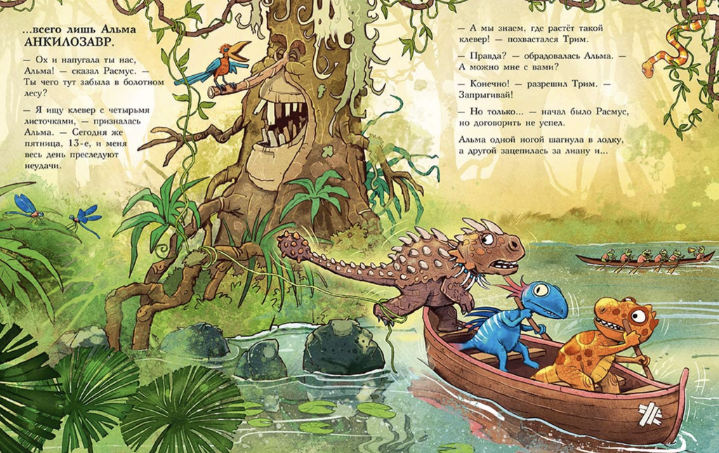 Каждая книга серии «Друзья-динозаврики» рассказывает об одном дне из жизни тираннозаврика Расмуса Рекса и его лучшего друга Трима Троодона. И вот как раз этот день у Расмуса не задался с утра. Только он встал с кровати, как поскользнулся, упал и врезался носом в комод. А всего через пару минут под ним проломилась половица, и он рухнул в подвал. Почему? Да потому, что сегодня была пятница, 13-е – день невезения! Хорошо, что Трим знал способ, как избавиться от всех несчастий. Надо найти клевер-четырехлистник, закрыть глаза, загадать желание, бросить клевер через левое плечо, и – опля! – желание сбудется! Правда, растет этот ключик к удаче в самой чаще болотного леса, на лугу под Голубой горой. Друзья берут у папы Рекса лодку и отправляются за клевером по реке, даже не представляя, сколько опасностей их ждет впереди…