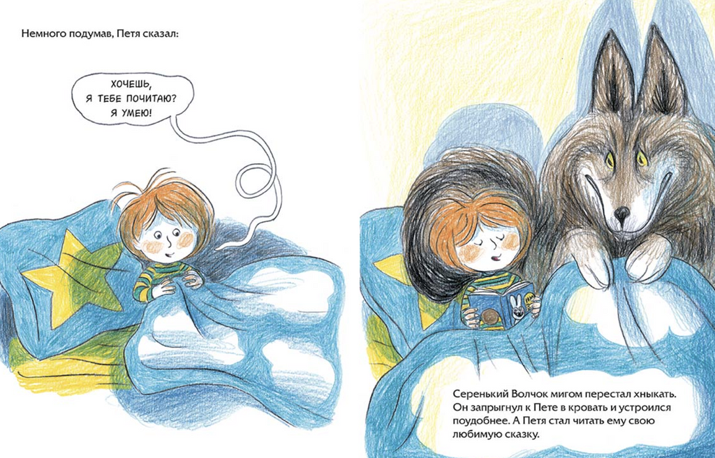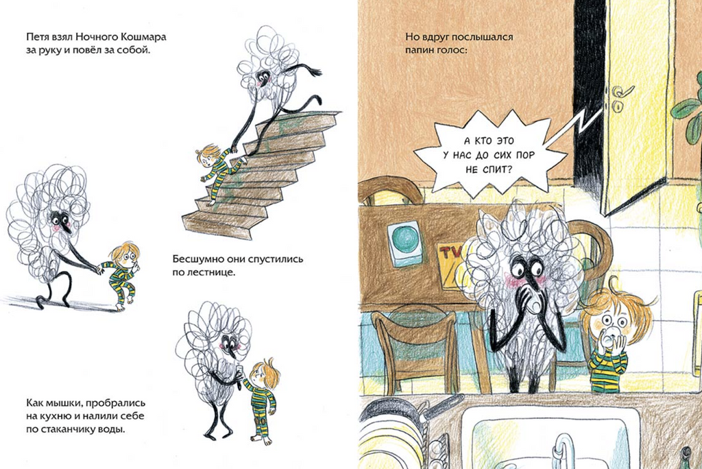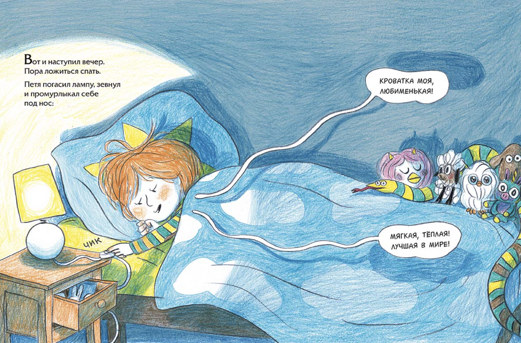 Петя решил разобраться. И выяснил, что у каждого монстрика была своя уважительная причина. Серенький Волчок завывал из-под кровати только потому, что никто не почитал ему на ночь. Шкафной Монстр забыл перед сном сбегать в туалет и хотел, чтобы кто-нибудь проводил его на горшок – вот и тарабанил по дверце шкафа. А Ночной Кошмар устроил возню за занавеской, чтобы попросить стакан водички. Оказалось, монстрики были совершенно обычными существами, которых вполне можно понять.