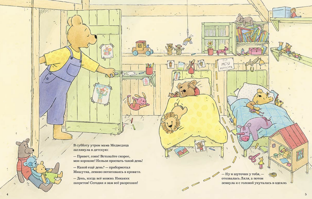 Однажды субботним утром, к огромному удивлению Ляли и Мишутки, мама Медведица объявила, что их ждёт очень необычный день: день, когда всё можно. Мама пообещала, что сегодня ничего не будет запрещать своим медвежатам, и они смогут делать всё что захотят.