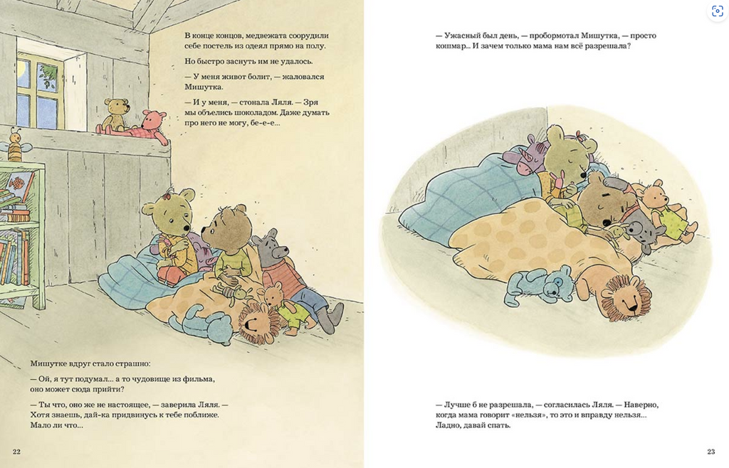 Ляля и Мишутка веселились на всю катушку. Сначала они были в полном восторге, но под вечер радость поутихла. От сладкого разболелись животы, кроватки, не выдержав прыжков, сломались, одежда промокла, подушки во время подушечных боёв порвались. Усталым бедняжкам было даже негде прилечь! К тому же повсюду чудовищный беспорядок, который медвежатам предстоит убирать.