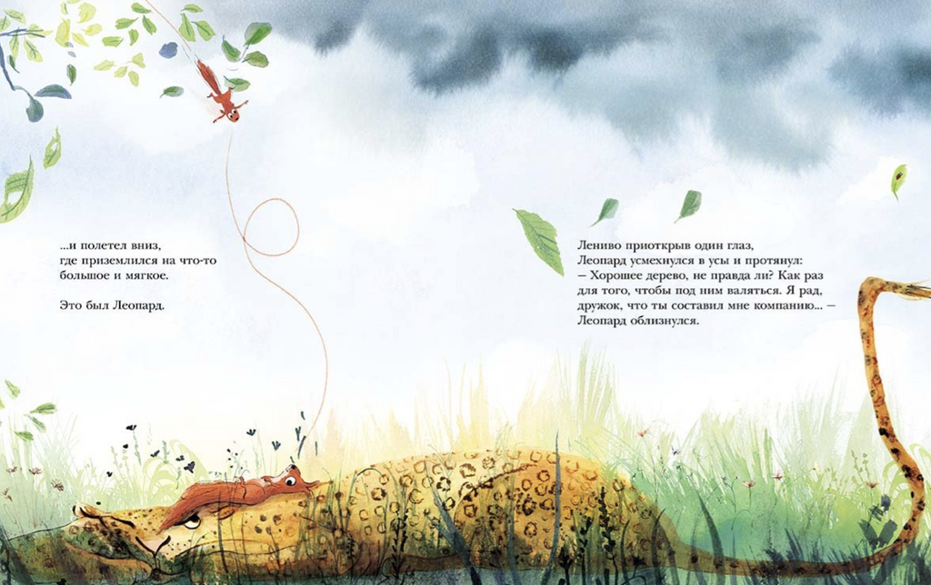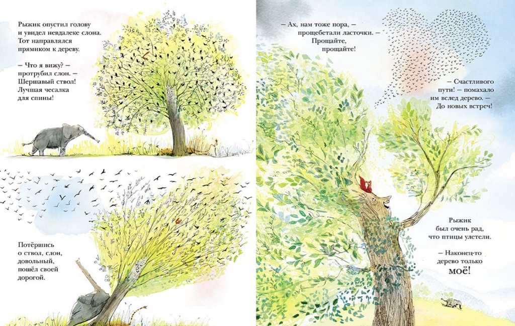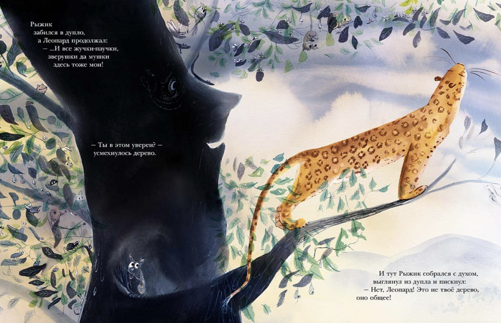 Правда, далеко уйти ему не удалось. Рыжик угодил в лапы леопарда, который, как ни странно, тоже считал дерево исключительно своим, поскольку любил отдыхать в его прохладной тени. Кроме того, хищник был уверен, что все обитатели дерева также принадлежат ему, леопарду… Как же он ошибался. Никто из насекомых и мелких зверушек, населявших дерево, не считал себя ничьей собственностью. Объединив усилия, они не только спасли Рыжика, но и навсегда прогнали леопарда.