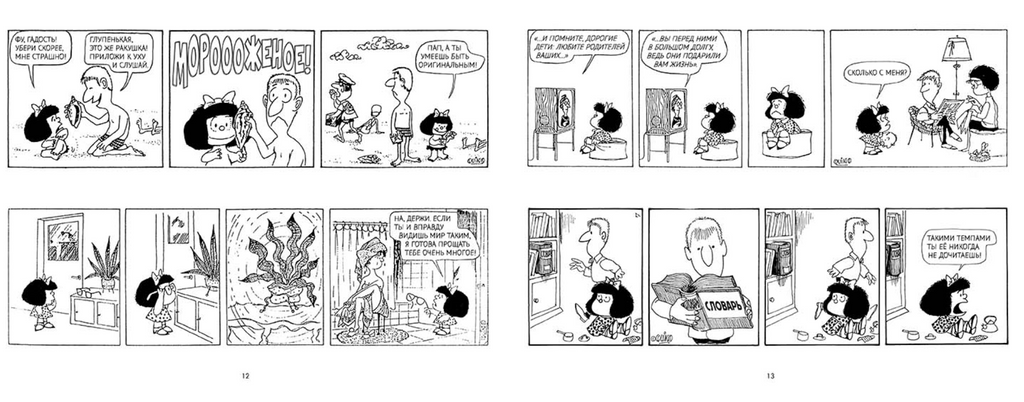 Мафальда – главная героиня одноимённой серии коротких комиксов, точнее, комикс-стрипов (от англ. strip – полоска, лента, где один горизонтальный ряд кадров – одна история), созданных всемирно известным аргентинским художником-карикатуристом Хоакином Сальвадором Лавадо (1932–2000), более известным под псевдонимом Ки́но.