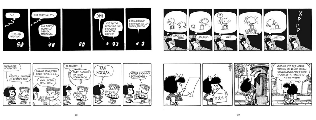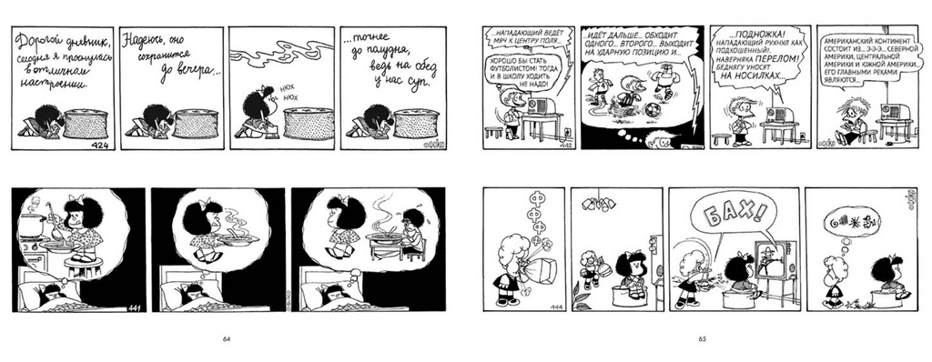 «Мафальда. Всё сложно не по-детски» – долгожданная первая публикация Ки́но на русском языке. В этот сборник вошли сюжеты, которые будут понятны и близки читателям любого возраста. Помимо классических стрипов периода 1964–1973 годов в него включён особый проект Ки́но 1977 года – «Декларации прав ребенка, прокомментированная Мафальдой и её друзьями для Детского фонда ООН (ЮНИСЕФ).