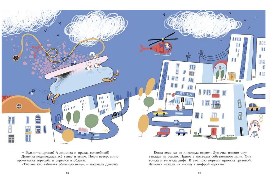 На улице было шумно, по дороге носились тазики на колёсах и важно плыли огромные ванны с номерами. В обувном магазине Душечка купила себе на ножки две пары туфелек и ещё две пары кроссовок на смену. И отправилась гулять в парк. В парке продавали сладкую белоснежную пену, которую продавщица называла сахарной ватой. В ларьке дяденька взбивал цветную пену и наливал в стаканчики с трубочками. Душечка всё это перепробовала, а потом залпом влила в себя земляничный лимонад с волшебным вкусом… и полетела над городом. Мимо прожужжал вертолёт, и Душечка решила, что это он взбивает облачную пену. Когда весь газ из лимонада вышел, Душечка опустилась на землю прямо у своего подъезда. А дома она усадила Илюшу к себе и рассказала о своей чудесной прогулке. С тех пор ванна Душечка полюбила путешествовать, а Илюша — купаться. Ведь сидя на берегу, новые земли не окроешь!