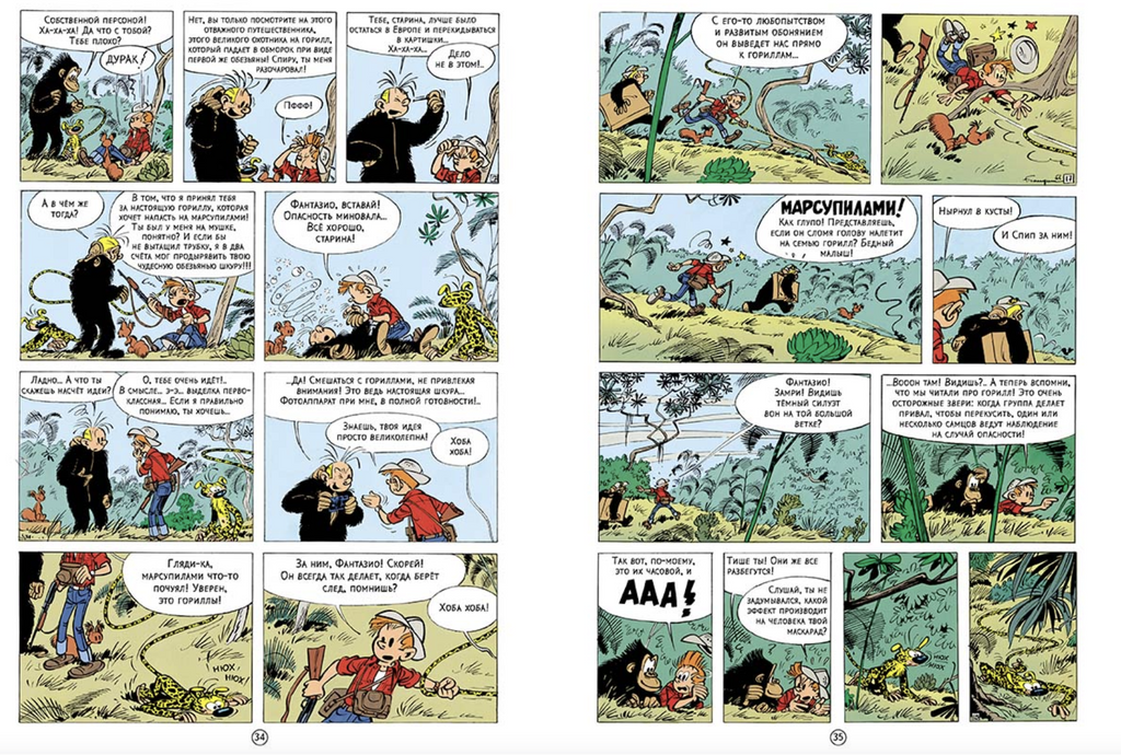 В первой из них Спиру и Фантазио отправляются в экспедицию на Килимакали, чтобы снять фоторепортаж о жизни горных горилл. В деревне Моломонга они узнают, что на прииске творятся странные вещи. Полгода назад ушёл в лес и не вернулся доктор Зварт, затем стали пропадать туземцы. В деревне царит ужас: туземцы уверены, что это гориллы похищают людей! Инженеры прииска убеждают Спиру и Фантазио, что никаких горилл на южном склоне Килимакали нет. Вечером ни с того, ни с сего вспыхивает их автомобиль. К счастью, ящик с фотоаппаратурой успевают вытащить, иначе от восхождения пришлось бы отказаться. Наутро друзья в сопровождении проводника и троих носильщиков покидают прииск. Когда они переходят через реку, под ними рушится верёвочный мост и часть снаряжения тонет. Потом исчезает один из носильщиков. А когда измученные тяжёлой дорогой они добираются наконец до туманной страны обезьян, их лагерь окружают воины племени вагунду. Конечно, всё это неспроста, и вскоре друзья узнают, кто чинит им препятствия и почему…