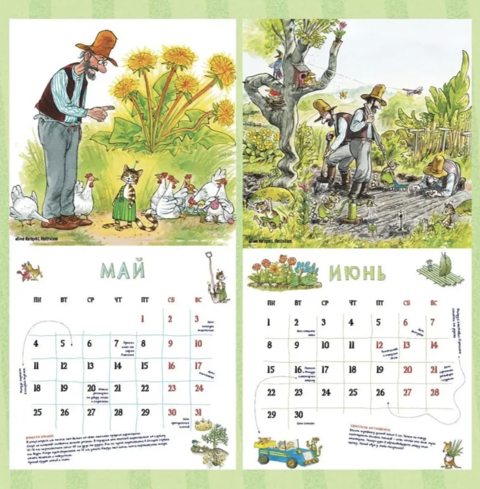 Петсон и Финдус подготовили целый календарь на будущий год, каждый месяц которого наполнен приключениями и сюрпризами! Вместе с героями вам предстоит отпраздновать множество событий, которые то и дело отмечают мюклы! Петсон и Финдус оставили много напоминаний на полях календаря - чтобы вы не забыли о самом интересном. Свен Нурдквист — шведский писатель и художник, родился в 1946 году в Хельсингборге. Свен изучал архитектуру в университете, а мастерство иллюстратора осваивал на дистанционных курсах. После учебы зарабатывал рисунками для рекламы и учебных пособий, оформлял плакаты и поздравительные открытки. В 1984 году вышла первая книга о Петсоне и Финдусе — «Именинный пирог». Тогда начинающий шведский писатель еще не догадывался, какую славу принесут ему эти персонажи.