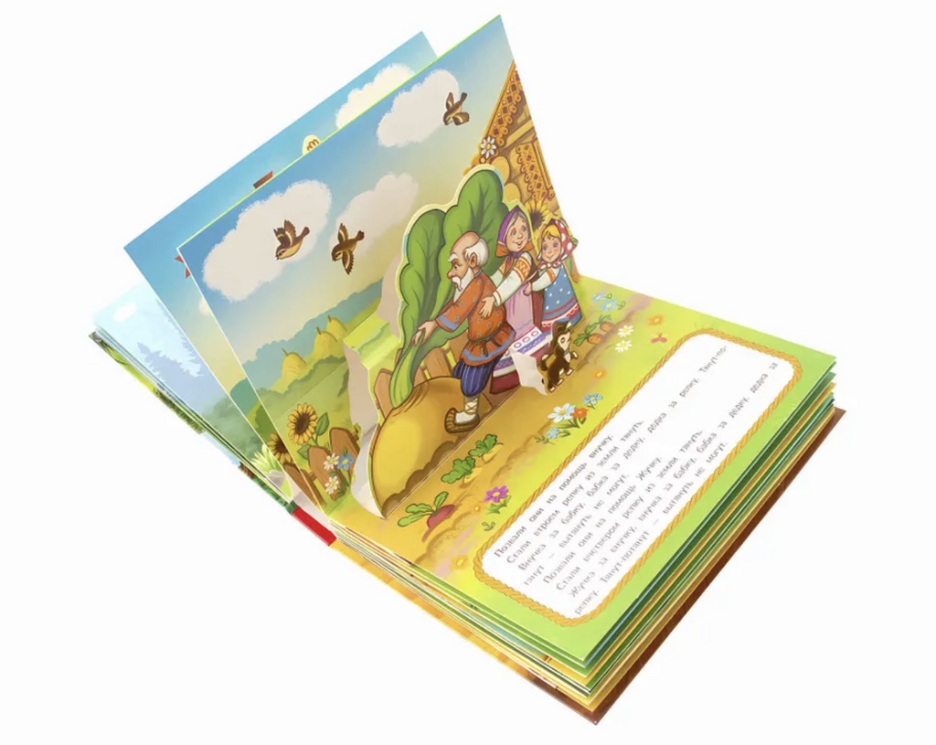 Уникальная на рынке серия сборников популярных сказок pop-up "Путешествие в сказку" с объемными панорамными иллюстрациями. В сборнике 4 любимых произведения: "Теремок", "Репка", "Колобок", "Курочка Ряба".