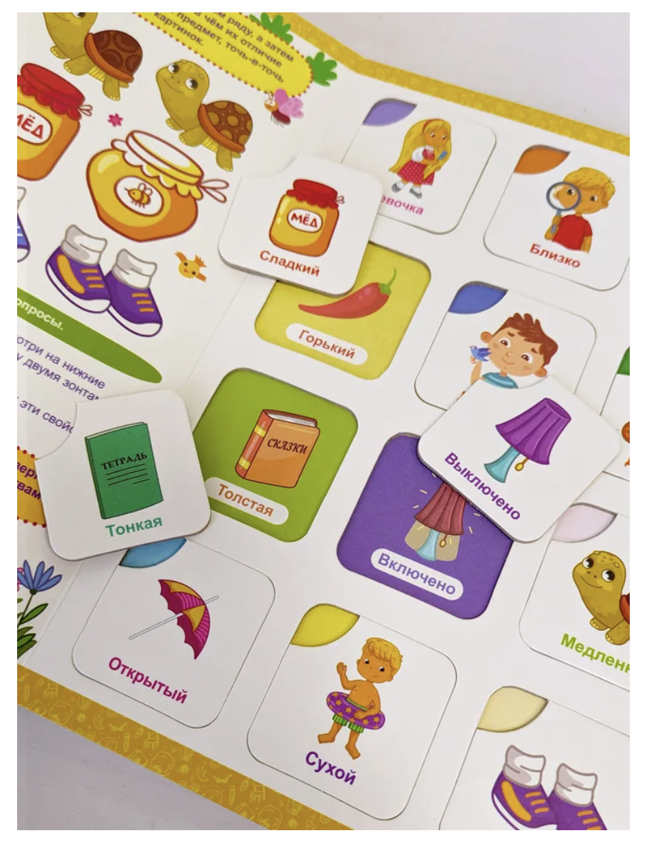 С книгой-лото "Противоположности" ребенок в занимательной форме познакомится с миром протиповоложностей и научится выявлять общие признаки и различия. На 8-ми страницах малыш найдет 48 карточек, которые помогут выполнить множество увлекательных и развивающих заданий, созданных по методике Виктории Белых - педагога-психолога с 25-летним стажем работы с детьми.