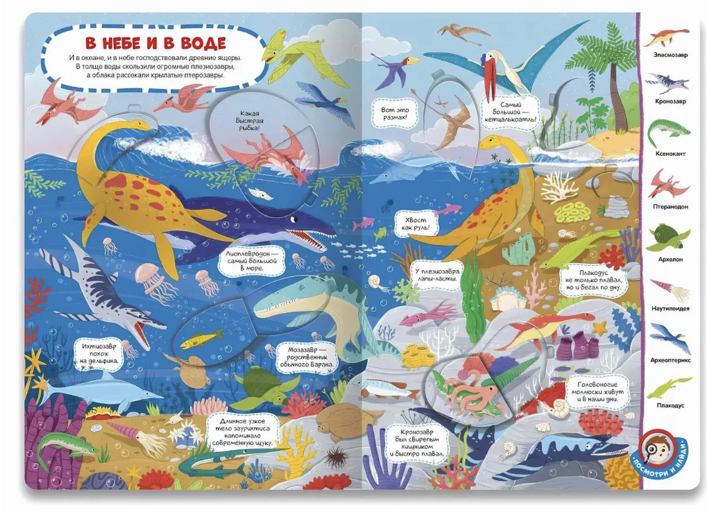 Виммельбух с окошками «Динозавры» — это большая красочная книга-картинка, на страницах которой малыш сможет познакомиться с удивительными древними животными. Путешествуя по доисторическим эпохам, ребёнок встретится с гигантскими насекомыми, первыми млекопитающими, и, конечно же, с динозаврами: травоядными и хищными, наземными, водоплавающими и летающими. Увлекательные окошки оживят иллюстрации и позволят ещё глубже погрузиться в исследование древнего мира. Окошки имеют удобную выемку для детских пальчиков, чтобы ребёнку было удобно открывать их. Книга выполнена из плотного картона с ламинированной обложкой. Листайте книгу вместе с малышом, открывайте окошки и узнавайте новое!