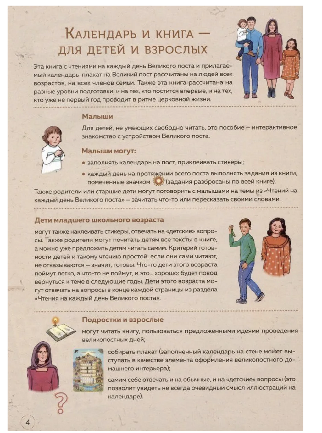 Книга и прилагаемый плакат-календарь на Великий пост — наглядное объяснение устройства и смысла Великого поста. Понятным языком, с отсылками к святым отцам, культуре и литературе рассказывается о молитвах и богослужениях Великого поста, о добродетелях, на которые важно обращать внимание в пост и детям, и взрослым. Книга и плакат оформлены красочными иллюстрациями. Для всей семьи.