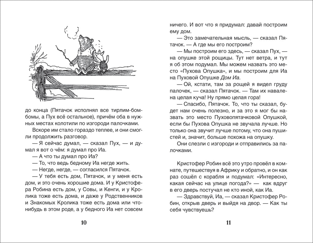 В книгу вошли истории из цикла «Винни-Пух. Дом на Пуховой Опушке» про веселого, никогда не унывающего медвежонка и его друзей: мальчика Кристофера Робина, поросенка Пятачка, Кролика, ослика Иа-Иа и многих других. Придумал их замечательный английский писатель Алан Милн, а иллюстрации нарисовал знаменитый художник Эрнест Хауард Шепард. На русском языке истории рассказал поэт и переводчик Борис Заходер.