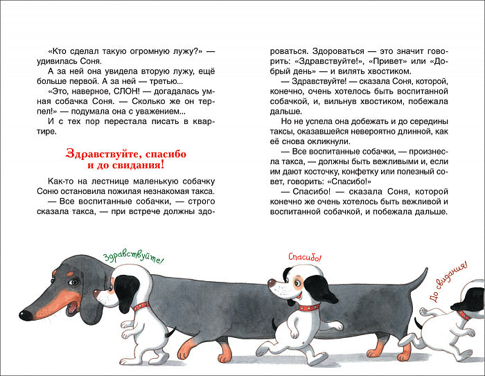 Собачка Соня - очень умная собачка. Почему? Да потому, что она обо всем раздумывает, а если много думать, то непременно станешь умным. Но, несмотря на ее раздумья, а может, из-за них, Соня постоянно попадает в самые забавные ситуации. В книгу вошли циклы рассказов «Умная собачка Соня» и «Знаменитая собачка Соня».