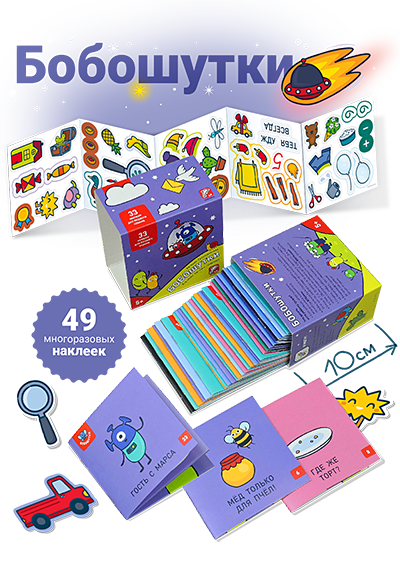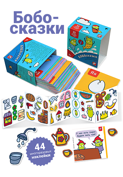 Наборы «БОБуквы», «БОБОсказки» и «БОБОшутки» помогут ребёнку сделать первые шаги в самостоятельном чтении. В каждой коробочке вы найдёте 33 книжки и лист наклеек. Каждая из 99 книжек – это увлекательная история, по которой учиться читать легко и весело. Самостоятельно прочитанная книжка – повод для гордости.