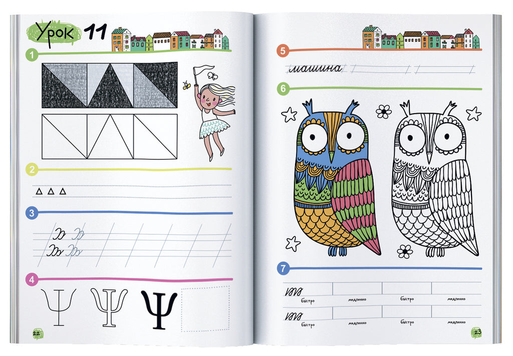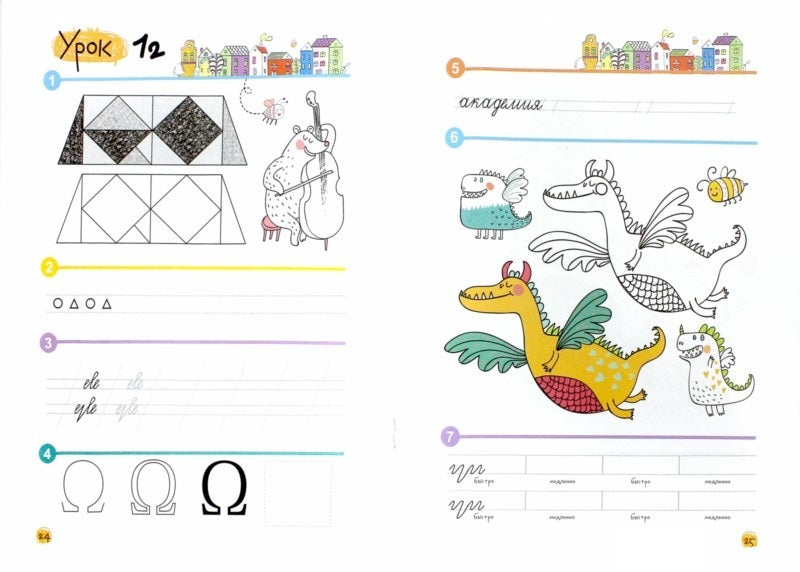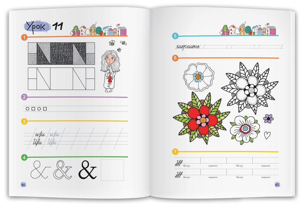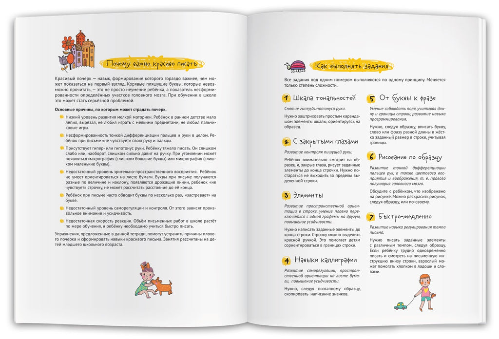 Красивый почерк — навык, формирование которого гораздо важнее, чем может показаться на первый взгляд. Корявые пляшущие буквы — это не просто небрежность ребёнка, а показатель несформированности определённых участков головного мозга. При обучении в школе это может стать серьёзной проблемой. Упражнения, предложенные в данной тетради, помогут ребёнку развить соответствующие участки мозга и выработать красивый почерк. Ребёнок научится снимать гипер/гипотонус руки и контролировать пишущую руку, соблюдать границы строки, плавно переключаться с одной графемы на другую, регулировать темп письма; разовьёт пространственную ориентацию в строке, усидчивость, тонкую дифференциацию пальцев рук, цветовое восприятие и воображение, т.е. правое полушарие мозга. Занятия построены по принципу от простого к сложному и рассчитаны на детей младшего школьного возраста.