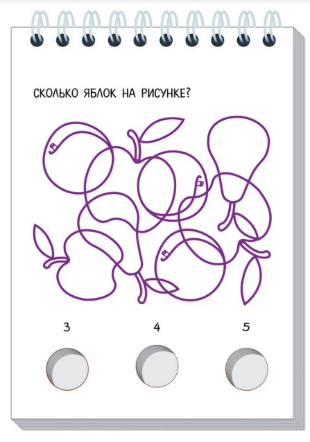 Ребёнок может самостоятельно проверить решение. Выбрав один из трёх вариантов ответа, он должен вставить указательный палец в окошко и перевернуть страницу. Если у выбранного отверстия есть цветной ободок - значит, ответ верный.