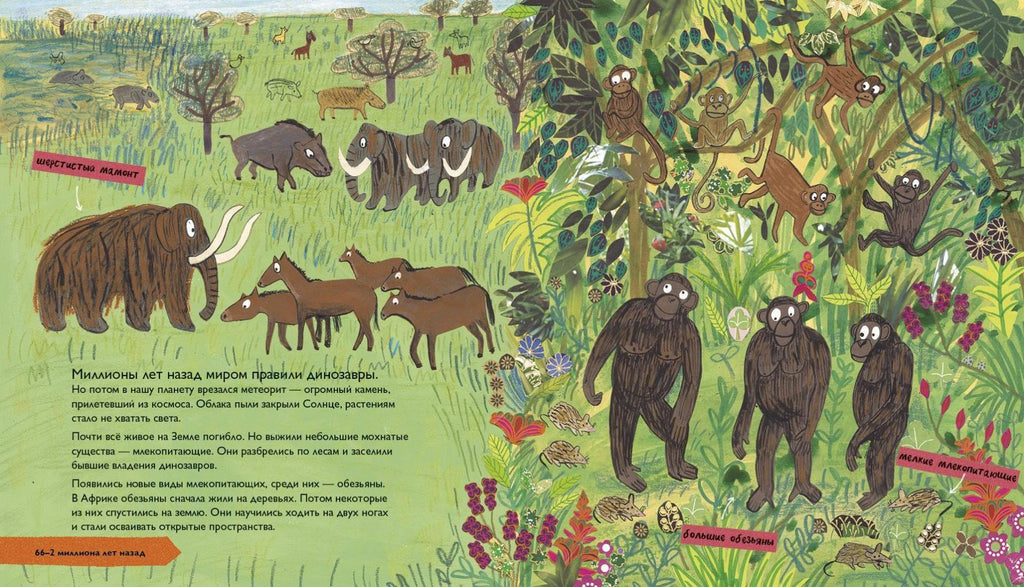 История человечества началась миллионы лет назад, задолго до появления первых людей. В Землю врезался метеорит, и мир погрузился в темноту. Среди тех, кому удалось выжить в той катастрофе, оказались маленькие покрытые мехом существа — млекопитающие. Звучит невероятно, но все мы — их потомки… Учёные и педагоги Кэтрин Барр и Стив Уильямс объясняют историю эволюции человека понятно даже дошкольнику и при этом в соответствии с современными научными представлениями. А иллюстратор Эйми Хасбанд рисует доисторических людей и их предков и потомков с иронией и нежностью.