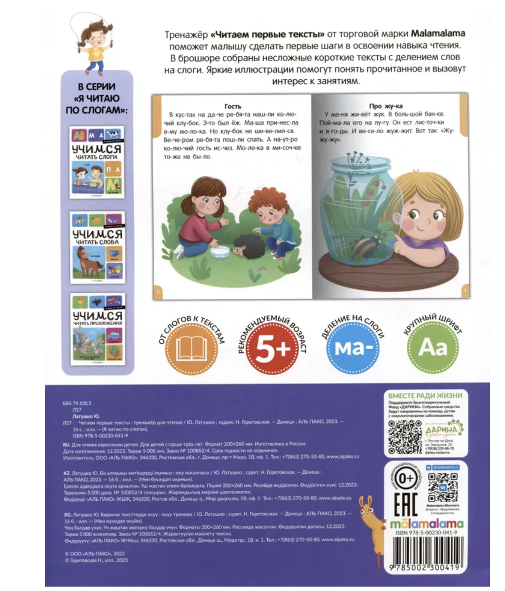 Тренажёр «Читаем первые тексты» от торговой марки Malamalama поможет малышу сделать первые шаги в освоении навыка чтения. В брошюре собраны несложные короткие тексты с делением слов на слоги. Яркие иллюстрации помогут понять прочитанное и вызовут интерес к занятиям.