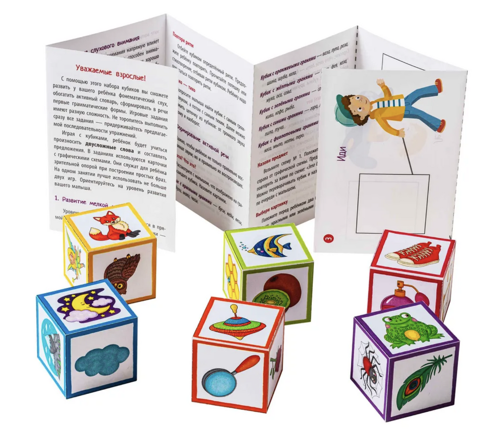 Набор состоит из 6 кубиков с изображением животных и предметов. С его помощью вы сможете развить слуховое внимание и активную речь вашего ребёнка. Благодаря различным наполнителям каждый кубик издаёт свой звук. Ребёнок будет учиться различать звуки, их громкость, отбивать ритм. С помощью системы заданий, составленной логопедами, ребёнок будет учиться произносить двусложные слова. Наклейки на кубики сделаны из качественной гладкой бумаги, которая не портится от игры. Адресовано детям от 1 года