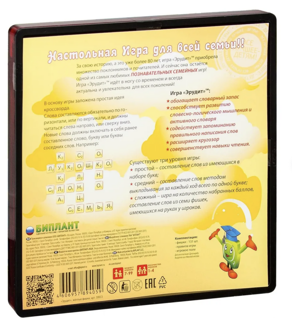 За свою историю, а это уже более 80 лет, игра «Эрудит» приобрела уйму поклонников и почитателей. И сейчас она остается одной из самых любимых познавательных семейных игр! Игра «Эрудит» идет в ногу со временем и всегда остается актуальной и увлекательной для всех поколений! В основу игры заложена простая идея кроссворда. Слова составляются обязательно или по горизонтали, или по вертикали и должны читаться слева направо или сверху вниз. Новые слова должны включать в себя ранее составленное слово, букву или буквы соседних слов. Игра «Эрудит»: обогащает словарный запас, способствует развитию словесно-логического мышления и активного словаря, содействует запоминанию правильного написания слов, расширяет кругозор, совершенствует навыки чтения.