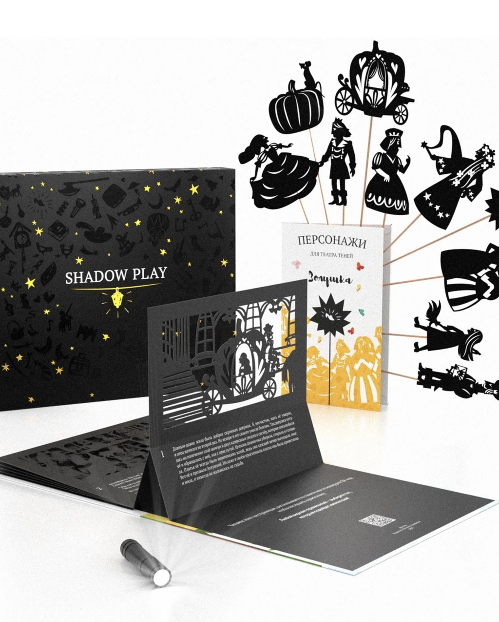 В коробке 8-10 (в зависимости от сказки) резных картонных персонажей на изящных палочках, а так же подставка для смартфона.